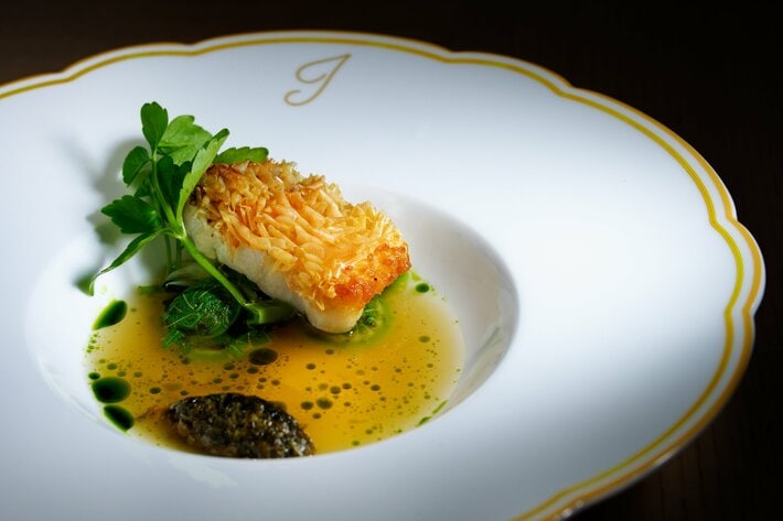 コースの幕開けを飾るのは、フランス料理の真髄ともいえるフォアグラと、春に瑞々しい甘みを湛えるデコポンのマリアージュ。クラシックなテリーヌの技法を基調に、デコポンの鮮やかな酸味を合わせることで、重厚さの中に軽やかさが宿る一皿に仕立てました。異なる個性が出会い、新たな調和が生まれる瞬間。ブランドの伝統と、大阪という都市の躍動が交わる場所で生まれた新たな物語、その始まりを表現した一皿です。