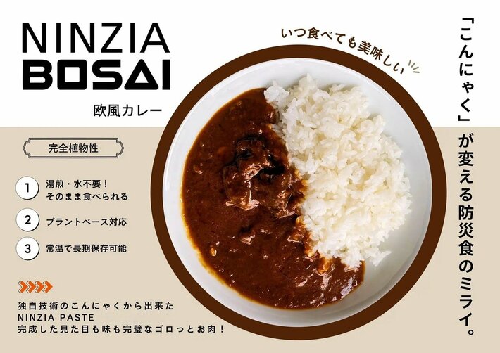 こんにゃく由来の高機能原料と独自のテクスチャ・エンジニアリング(食感創成)技術を提供する株式会社NINZIA(本社:神戸市中央区、代表取締役:寄玉昌宏)は、2026年3月11日(水)より、完全植物性の防災食「NINZIA BOSAI 欧風カレー(中辛)」の一般家庭向け販売を公式オンラインショップにて開始いたします。これまで企業のオフィス備蓄(B2B)限定で展開していた本製品を、日常の食卓でもお楽しみいただけるよう販路を拡大しました。
