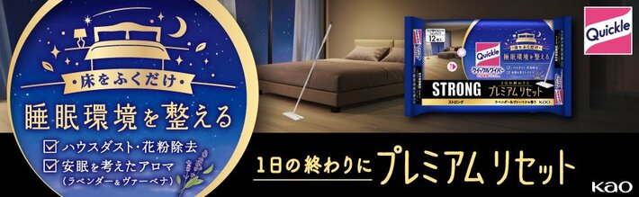 そこでこのたび、花王「クイックル」より、『クイックルワイパー 立体吸着ウエットシート ストロング プレミアムリセット』を新たに発売いたします。 “一日の終わり”眠りにつく前のタイミングに床をそうじすることで、睡眠中にも気になるハウスダストや花粉などを舞い上げずしっかり除去します。さらに安眠を考えたアロマの香りをシートに採用し、睡眠環境を整える“夜そうじ”を提案いたします。