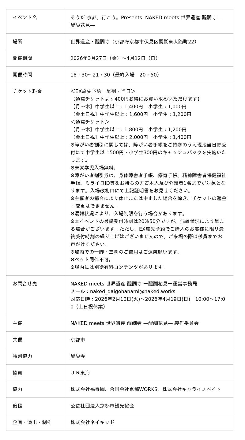 株式会社ネイキッド(英語表記:NAKED, INC. 、所在地:東京都渋谷区、代表:村松亮太郎)は、世界遺産・醍醐寺(京都市伏見区)にて、2026年3月27日(金)~4月12日(日)の期間、『NAKED meets 世界遺産 醍醐寺―醍醐花見―』において、醍醐寺とのイベント限定コラボレーション御朱印や老舗茶舗・福寿園との呈茶体験、和ろうそくワークショップ、そして夜桜と共に楽しむ飲食メニューをお届けします。