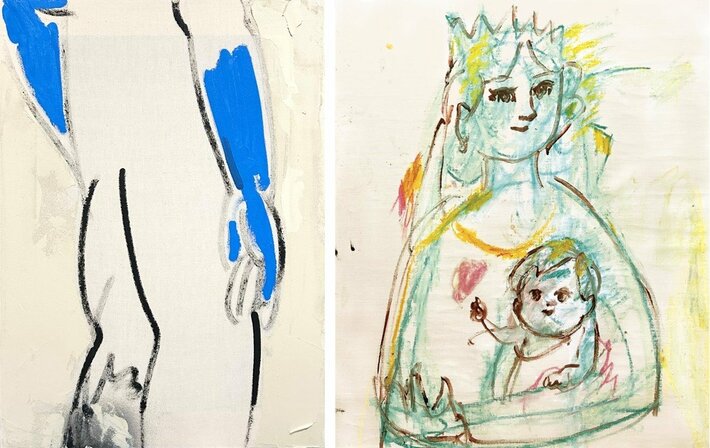 (写真左から)須田日菜子「おしり1.」(H480×W350mm/綿布、アクリル、スプレー/2026年)、植田工《A Mother, A Child》(H727×W606mm(F20号)/アクリル、オイルパステル、チョーク、キャンバス/2026)