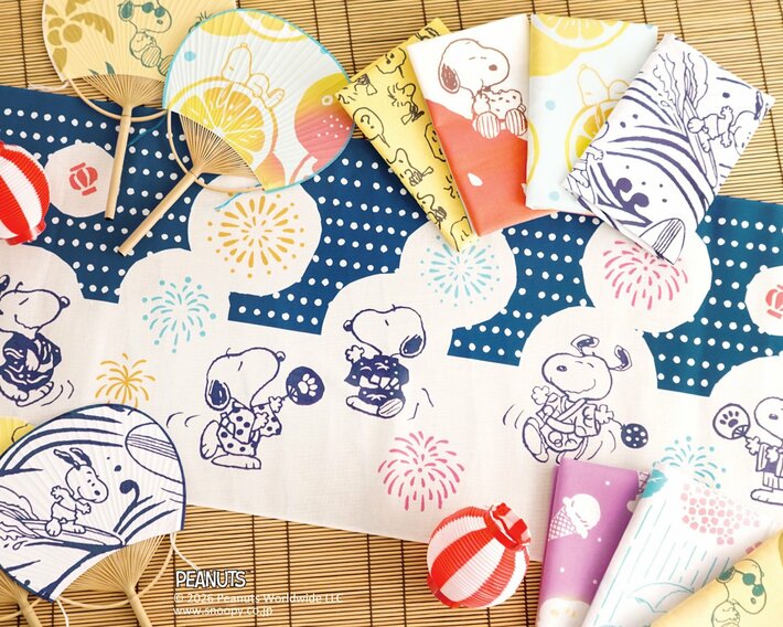 世代を超えて世界中で愛されているスヌーピーと仲間たちが「夏のお出かけ」をテーマに、盆踊りやレジャーをモチーフにしたデザインの手ぬぐいがラインナップ。青や水色をベースにした爽やかな柄や、元気いっぱいのビタミンカラーを用いた柄など、夏らしいカラフルなデザインでお出かけシーンを盛り上げてくれます。さらに、同柄のコンパクトサイズ団扇「豆団扇」も4柄が登場。夏に大活躍の手ぬぐいとセットで使えば、コーディネートの幅も広がります。夏のアウトドアやお祭り、フェス、ビーチなど、さまざまなシーンを彩ります。