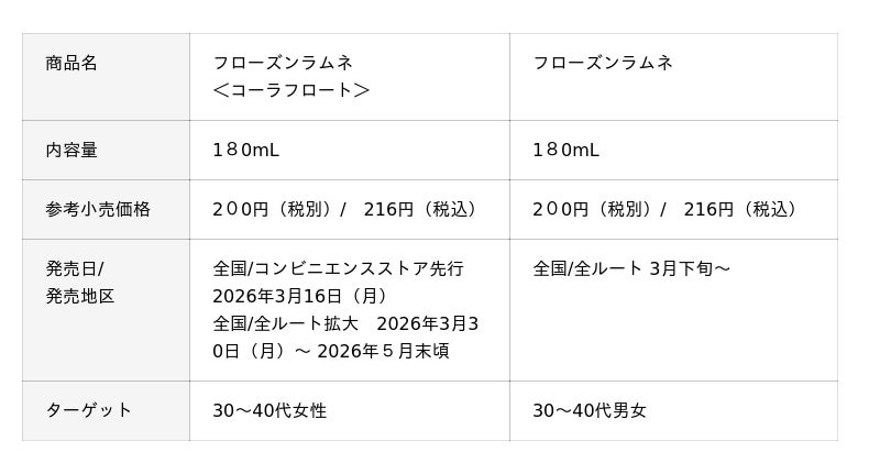 森永製菓株式会社(東京都港区芝浦、代表取締役社長COO・森 信也)は、「森永ラムネ」の味わいをイメージしたすっきり&クリーミーなフローズンデザート「フローズンラムネ」のコーラ味「フローズンラムネ<コーラフロート>」を3月16日(月)より全国のコンビニエンスストア先行で発売し、3月30日(月)より全国の全ルートに拡大し販売いたします。また、「フローズンラムネ」も品質やパッケージを見直し、3月下旬よりリニューアル発売いたします。