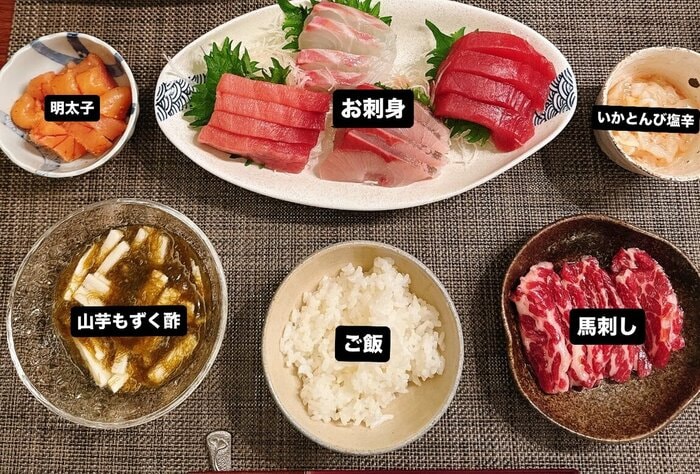 さらに小皿には明太子や山芋もずく酢、別皿にはご飯と馬刺しも用意。白や緑、赤、茶といった色合いが食卓を彩り、見た目にも食欲をそそります。いかとんびの塩辛も添えられており、まるでお店のような本格的な品数が並ぶ豪華な食卓です。