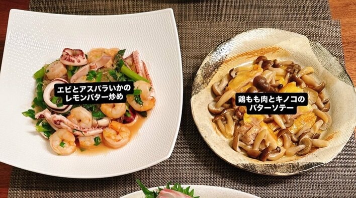 その上には、四角い白皿に盛り付けられたエビとアスパラ、イカのレモンバター炒めや、丸い器に入った鶏もも肉とキノコのバターソテーが並び、食卓に華やかさを添えています。