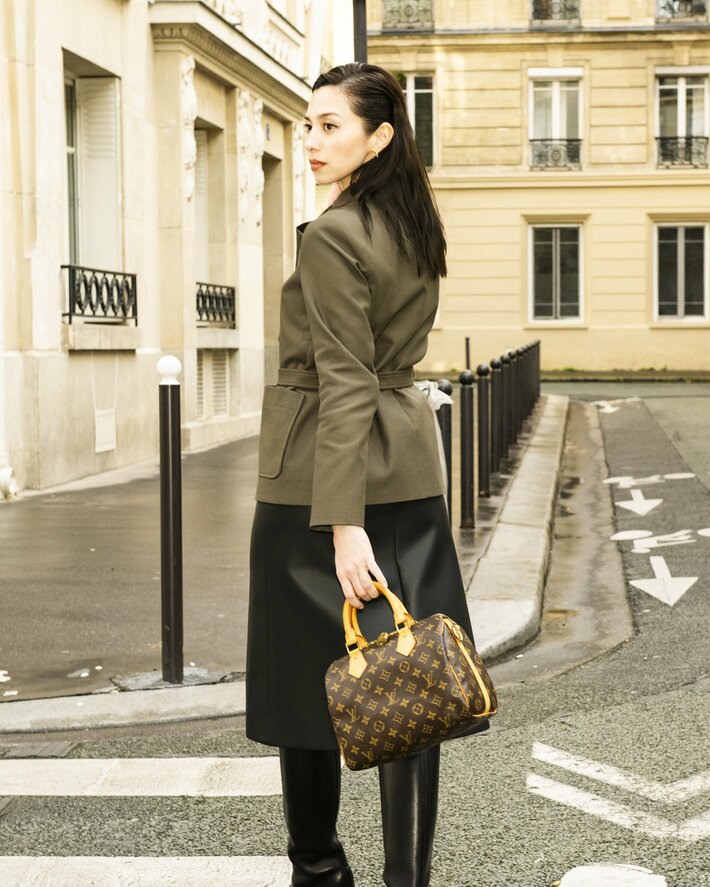 ジャケット¥621,500、ワンピース¥951,500、ロングブーツ(参考商品)、バッグ「スピーディ・バンドリエール 25」¥288,200、ピアス「ル ダミエ ドゥ ルイ・ヴィトン」 ¥770,000