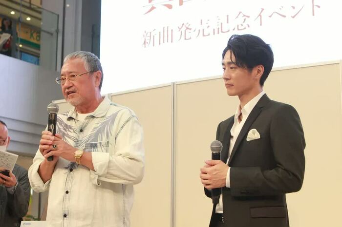 新曲「酔えねぇよ!」について、吉さんは「彼に合うメロディをということで書き下ろしました。(真田さんは)酒を飲むとすぐに赤くなっちゃうので、『酔えねぇよ!』が歌えるのかと思いましたが、男というのは、酔えないときもある。私にも当てはまる歌でもあります」と。