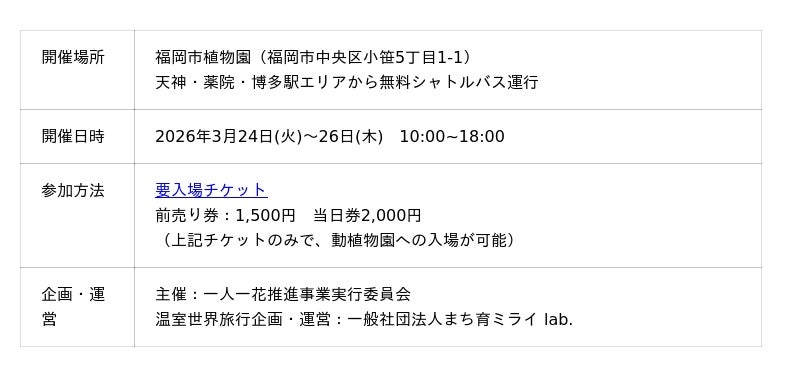 一般社団法人 まち育ミライlab. (本社:福岡市博多区 代表理事:水田ともこ)は、福岡市植物園で開催される「Fukuoka Flower Show 2026」のDay3~Day5の3日間、『温室世界旅行』を開催します。