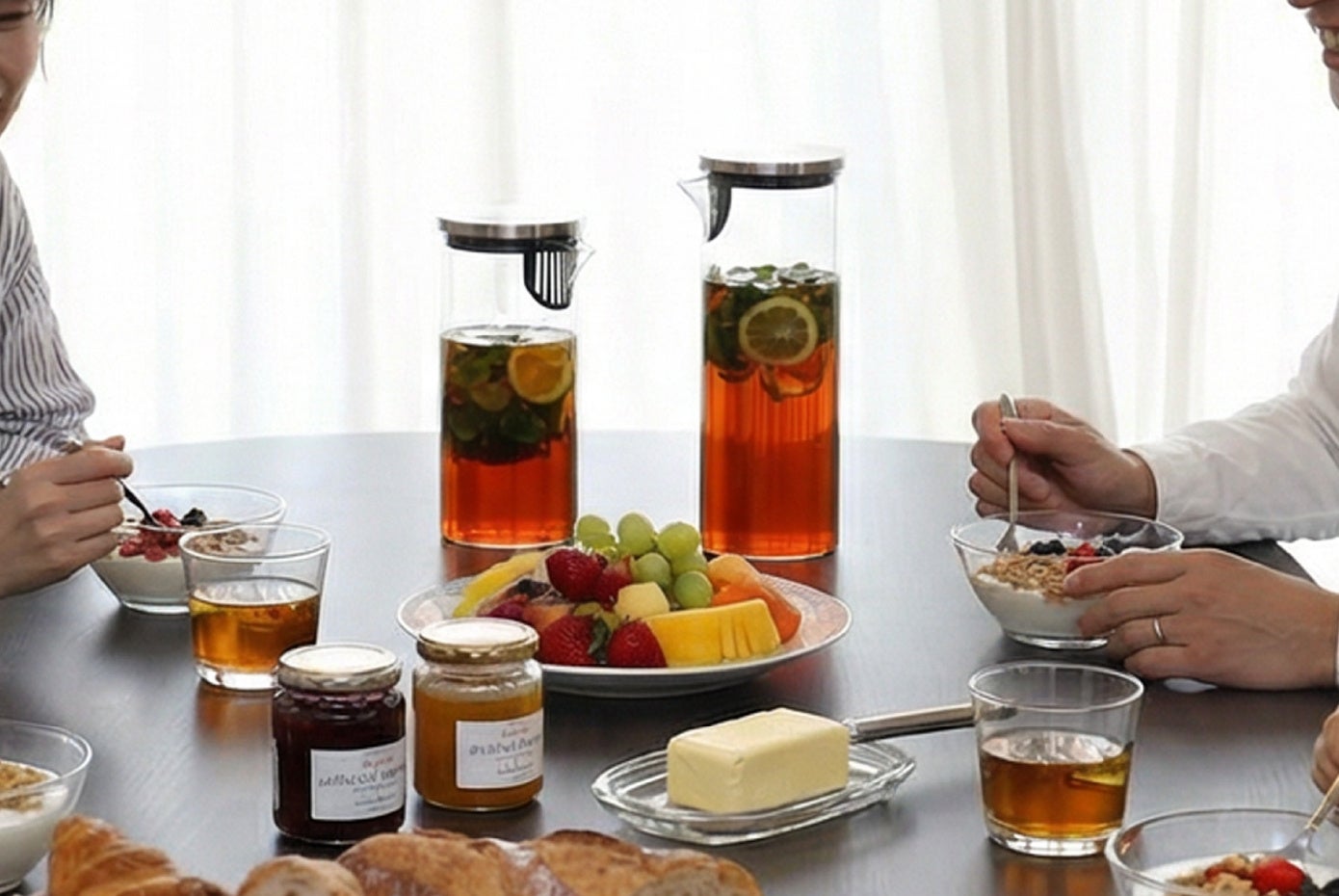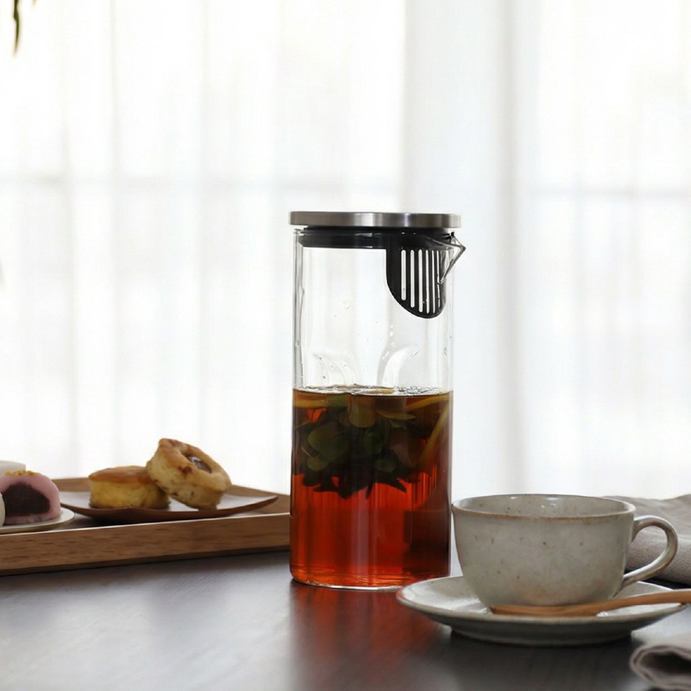 広口で洗いやすく、熱湯OK。麦茶ポットやフレーバーウォーターづくりに使えるフィルター付きで、冷蔵庫収納をすっきり整える。
