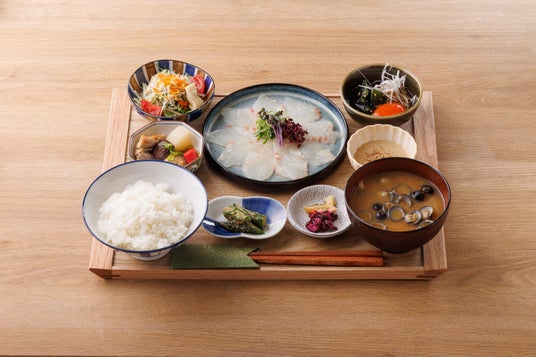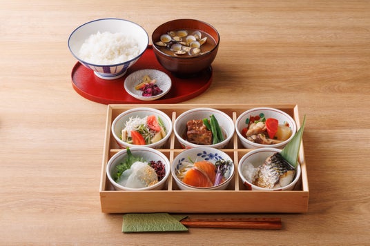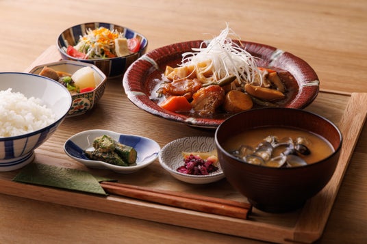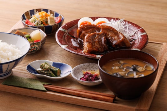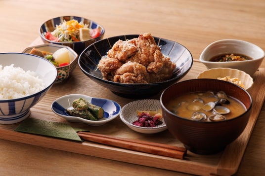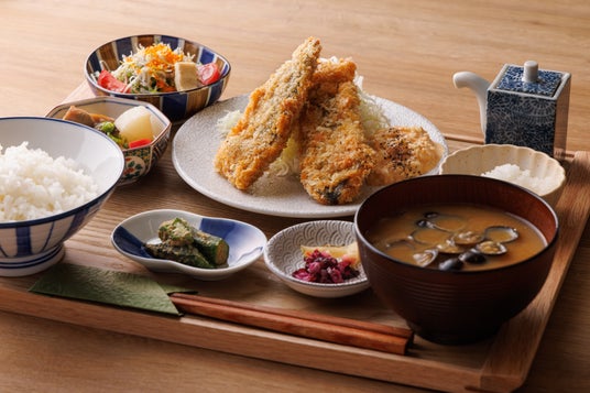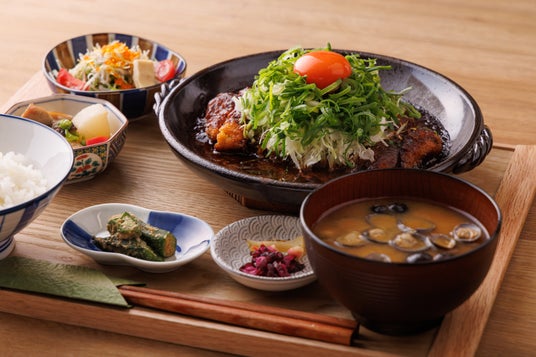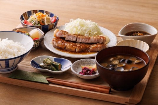 朝8時~11時限定で提供する「一汁六菜定食」は、少し贅沢な朝時間を楽しめる和朝食。伊勢真鯛のお刺身やサーモンのユッケ風、焼鯖、鶏肉と大根の煮物、豚角煮など彩り豊かな小鉢を少しずつ味わえます。炊きたての土鍋ごはん(宮城県産つや姫)と、身体に染み渡るしじみの味噌汁を添えた、心と体を整える朝限定の定食です。
