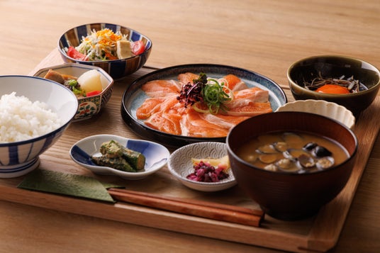 写真:サーモンのお刺身定食 海苔醤油と卵黄ユッケ