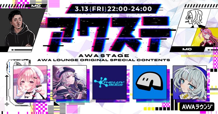 AWA株式会社(本社:東京都港区、代表取締役CEO:冨樫晃己)が運営する、サブスクリプション型(定額制)音楽ストリーミングサービス「AWA(アワ)」は、2026年3月13日(金) 22:00より、無料で誰でも参加できるオンライン空間「ラウンジ」で、ネットシーンを中心とした注目アーティストなどを毎回ゲストに招き、有識者であるMCとともにシーンの次のステージを切り開く番組「AWAステージ(通称:アワステ)」の第70回を開催いたします。