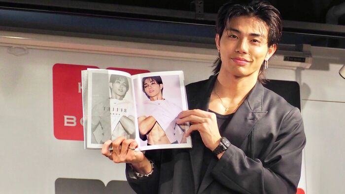 「僕にとって一番のファッションは裸といっても過言ではないくらい自信をもっているんですけど、自信があるからこそ隠したときに魅力が出るのかなって。ファンの方にも『海青くんは服を着ているときのほうがセクシーで魅力的」と言っていただけるので、その言葉を表現できた1枚になったのかな」とページを開きながら紹介しました。