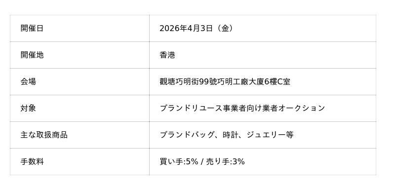 今回の香港開催は、すでに展開している上海・バンコクに続く海外拠点として、アジア圏におけるブランドリユース流通のさらなる活性化を目的としています。香港という国際都市を拠点に、日本・中国・東南アジアをはじめとする広域のバイヤーが参加する新たな取引市場の形成を目指します。
