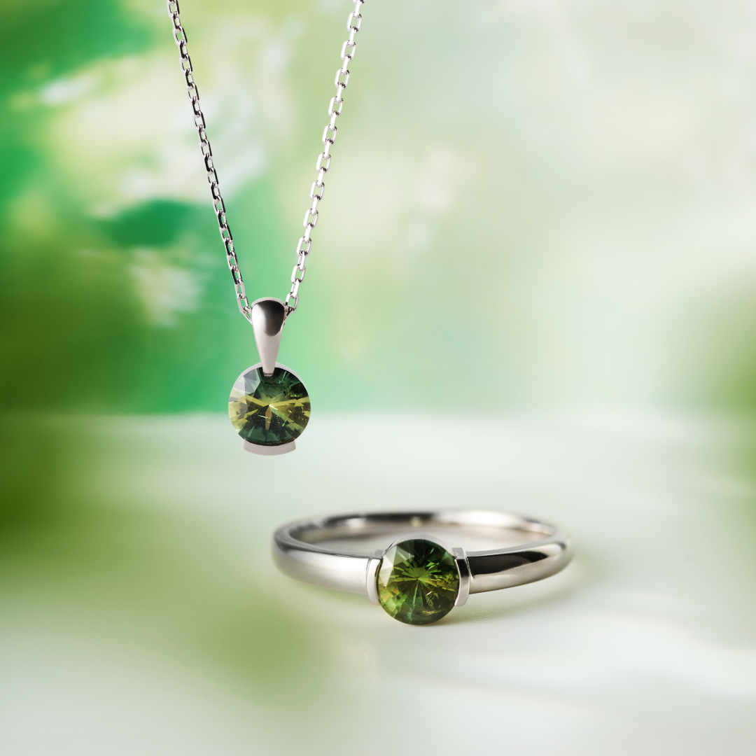 スリランカの情景を閉じ込めたような一石を、リングとネックレスに仕立てました。