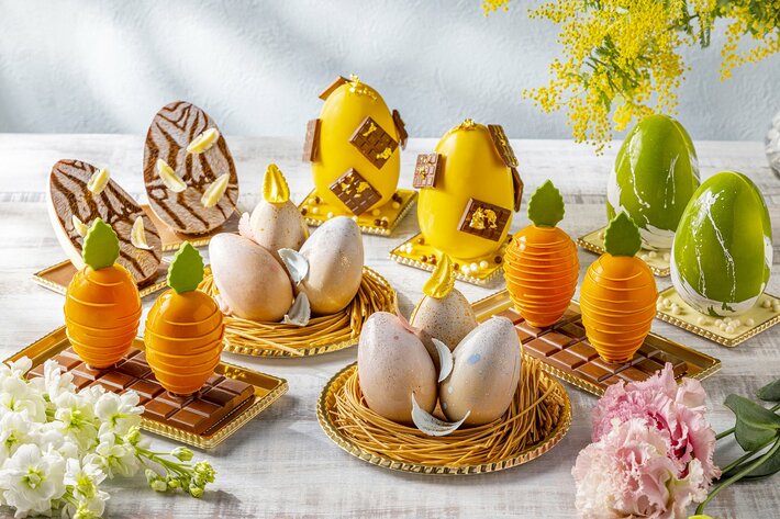 キリスト教の復活祭であるイースターは、クリスマスと並んで大切な日としてお祝いされます。欧米では春の訪れと共にカラフルなイースター・エッグやバニーが店頭に並び、華やいだ気分を盛り上げます。ヒルトン東京では、エグゼクティブ・ペストリーシェフ ラティーシュ・ナイヤー(Ratheesh Nair)が贈る卵やキャロットフォルムのチョコレートに加え、チョコレートで作る鳥の巣風アレンジの上に卵型チョコレート3個をセットした「エッグネスト」、イースターの定番、伝統的な「ホットクロスバンズ」もテイクアウトとしてご用意いたします。