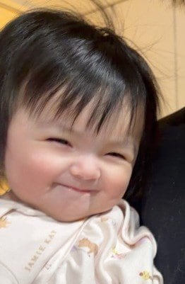 抱っこされ上機嫌なのでしょうか、ニコッと目尻を下げた満面の笑みでバッチリカメラ目線!思わず頬が緩んでしまうショットですね。