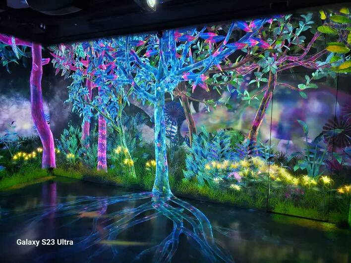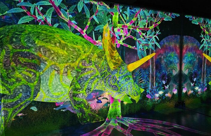 会場に入ると、チームラボの作り出した色鮮やかな太古の森が広がり、一瞬ここが原宿のビルの中だと忘れてしまう不思議な感覚に。