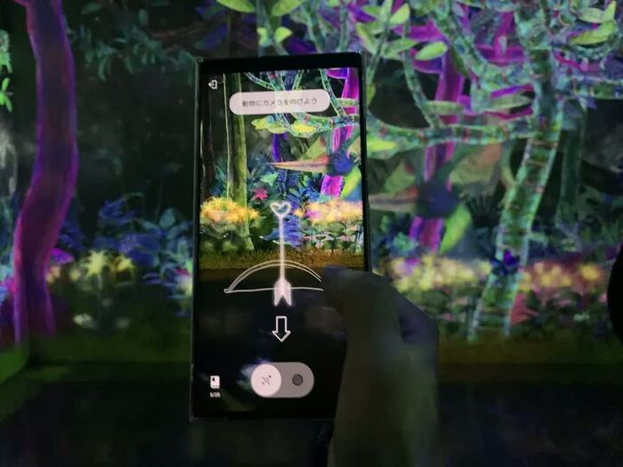 スマートフォンのアプリを使用して、カメラに写っている動物に「観察の矢」を放つと、目の前のスクリーンに矢が飛んでいきます。