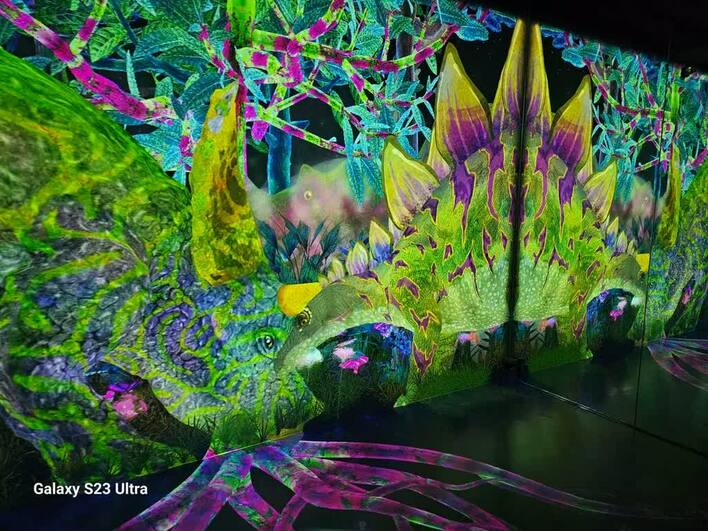 現在、Galaxy Harajuku(東京都渋谷区)では、スクリーンに映し出された非現実的な空間で動き回る恐竜を、スマホで捕獲&コレクションできるイベント「Galaxy & チームラボ:捕まえて集める恐竜の森」が開催中。