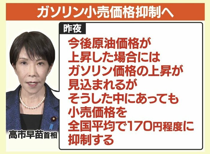 ただ、高市政権が対策をやるってことなんで、ガソリンだと170円以上には上がらないのかなと。
