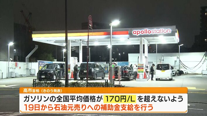 レギュラーガソリンの全国の平均価格が、170円/Lを超えないよう、石油元売りに対し、19日から補助金の支給を行うと発表。ガソリンスタンドの店頭価格には、1週間から2週間程度で反映される見通しです。