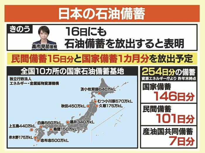 まず、民間備蓄15日分を放出し、その後、1カ月分の国家備蓄を放出して安定供給につなげる狙いです。