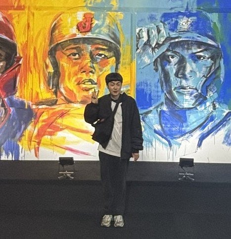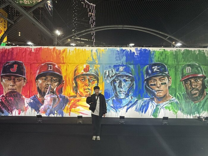 そこには、WBC日本代表である大谷翔平選手や山本由伸選手など、各国の選手が彩り鮮やかに描かれた大きな壁をバックにたたずむ赤木さんの姿が!