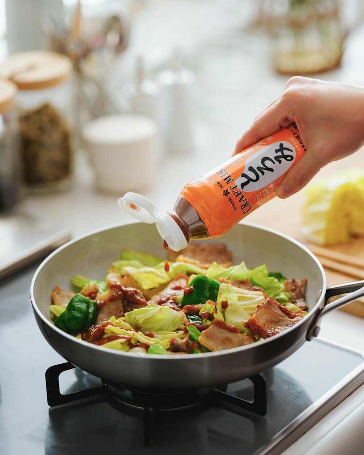 一般的な生味噌は、スプーンやお玉ですくい、溶いて使用する必要がありますが、本商品はフライパンにボトルから直接入れて調理したり、器に盛りつけた料理にそのままかけてお召し上がりいただけます。ボトルから片手でかけられるため調理がラクになり、より気軽に味噌料理をお楽しみいただけます。