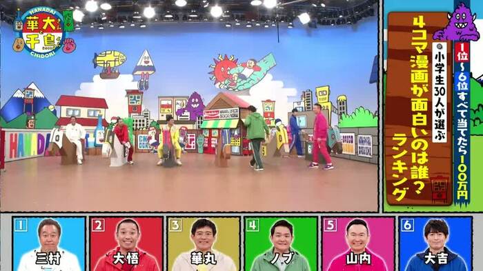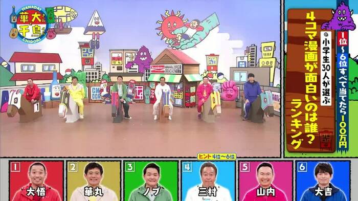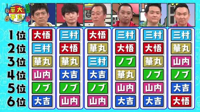 博多華丸さん、博多大吉さん、千鳥(大悟さん、ノブさん)、かまいたち(山内健司さん、濱家隆一さん)を含めた7人のうち、6人がランキングに参加し、3つのお題に対して全員で順位を予想しました。