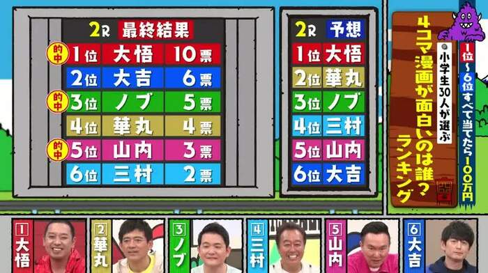 大悟さんの作品は「シーフード先生は笑うと思うよ」(大吉)「俺も!強い気がする」(三村)と支持される一方で、山内さんだけ最下位に予想。
