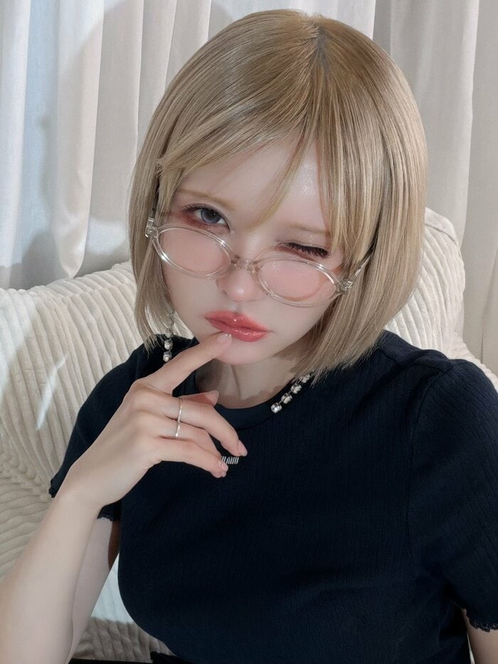 この日のコーデは、ピタッとした黒のシャツに身を包み、メガネをかけています。