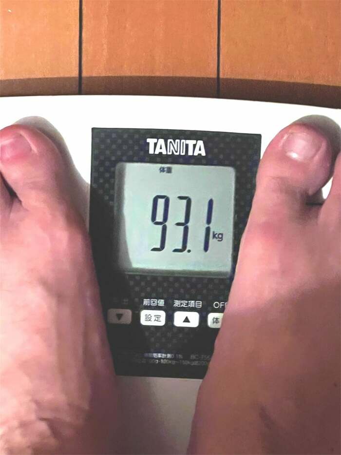 写真を見ると、体重計の表示画面には93.1キロと出ています!脇さんによると、「103キロから93キロまで落としましたがほとんど誰にも気づかれません」と、10キロ減量したといいます。