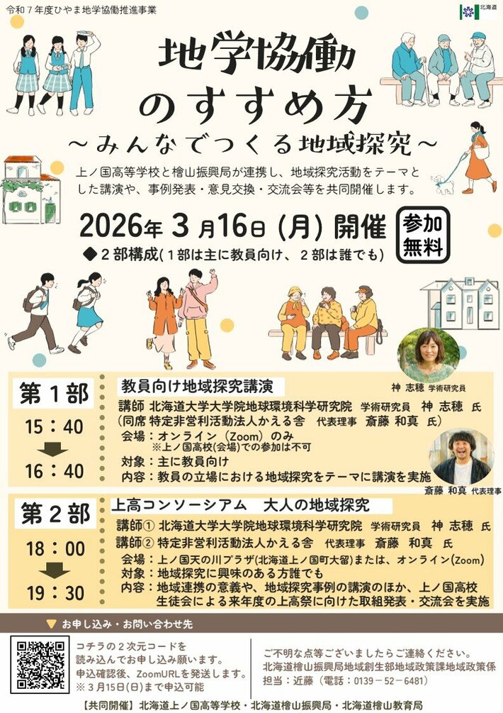 今回、北海道上ノ国高校と共同開催により、下記のとおり地域探究活動などをテーマに講演等を開催しますので、是非お気軽にご参加ください。