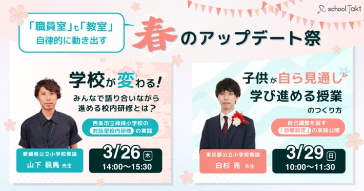 スクールタクトを使って行われた山下楓馬先生による「対話型校内研修」と、白杉亮先生による「目標設定の立て方」の実践を紹介。春休みの時期に合わせて、大人と子供の両面から学びをアップデートする2日間です。