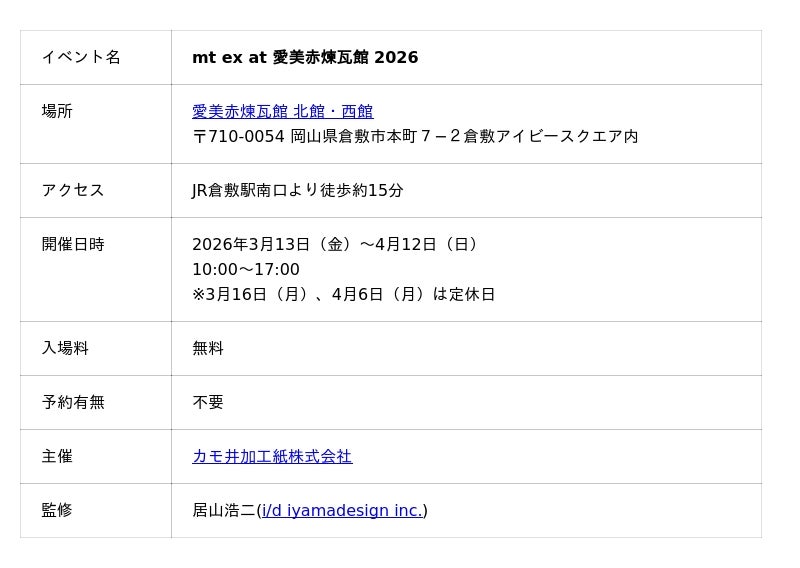 毎年、日本国内数か所で開催するmt ex展。2026年度最初のmt ex展は、カモ井加工紙倉敷本社で開催されるmt factory tour vol.15と同時期にて実施します。