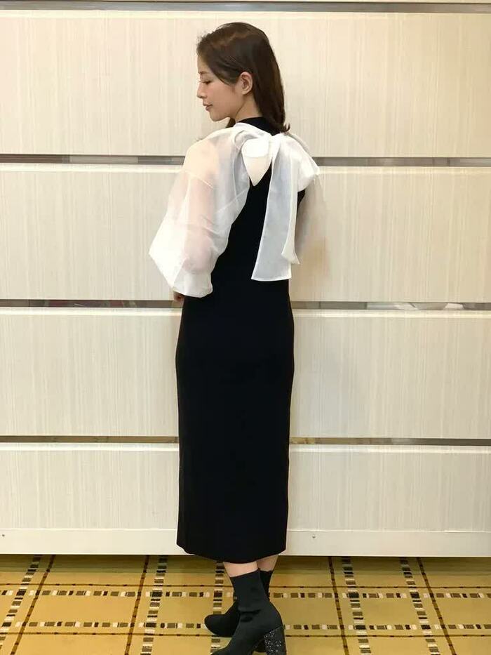 このワンピースは「CELFORD(セルフォード)」というブランドで、私はもともと、ここのお洋服が好きなんです。シンプルでありながら、バックリボンがついたデザインがかわいくて、シルエットもすごく素敵で。タイトですが、上がオーガンジーの生地でフワッと包まれていて、「かわいい!」と即決でした。