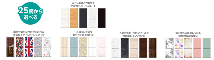 対応する冷蔵庫にピッタリ合うサイズのマグネットシートなので貼り直しがしやすく、工具や難しい作業は不要。ニトリの家具と合わせた柄もラインナップしており、冷蔵庫を買い替えなくても、インテリアに合わせた“自分らしいキッチン”づくりをサポートします。