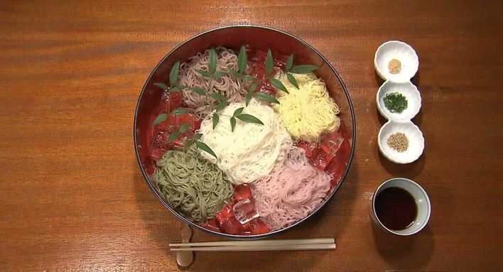 目の前に色鮮やかな茶そうめん、赤米麺、卵そうめん、梅そうめんが並び、松岡さんは「きれいな色ですね!」と感嘆の声をあげました。
