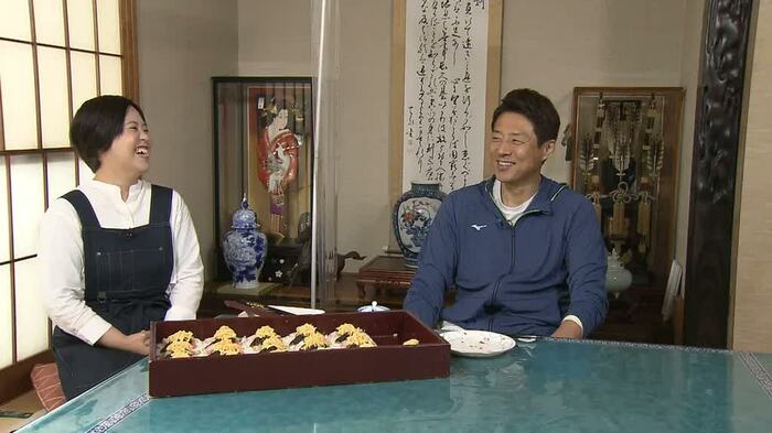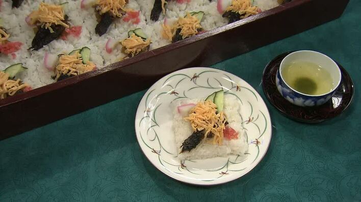 ムツゴロウ、奈良漬け、にんじん、しいたけ、きゅうり、紅しょうが、卵が酢飯にのった豪華な須古ずしを味わった松岡さんは「ムツゴロウの甘露煮がいいですね、じゅわっとジューシーで」と感想を伝え、さらに食べ続けます。