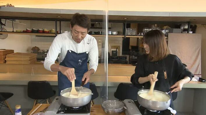 まずは、無調整豆乳を1パック分、くず粉と生クリームを鍋にのせたザルに入れていきます。くず粉を使うことに驚いた松岡さんに、古川さんは「にがりを使う一般的な豆腐ではなく、ごま豆腐に近い作り方」だと解説。そしてザルの中でダマがなくなるまで木べらで混ぜて溶かしていきます。