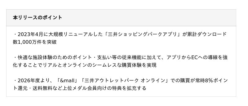 三井ショッピングパークアプリは今後も、商業施設、EC、会員プログラムを有機的に結びつけるプラットフォームとして進化を続け、より便利で魅力的な購買体験の創出と、持続的な顧客価値の向上を目指してまいります。