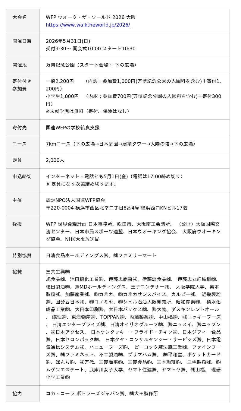 認定NPO法人国際連合世界食糧計画WFP協会(以下、国連WFP協会、神奈川県横浜市:安藤 宏基 会長)は、チャリティーイベント「WFPウォーク・ザ・ワールド 2026 大阪」を5月31日(日)に万博記念公園で 開催します。本イベントへの参加申込み受付を3月13日(金)より開始します。