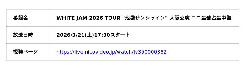 さらに、ライブの後半には「WHITE JAM史上最大の発表」が控えていることも判明! 2026年の彼らが歩む新たな道のりとは何か。音楽シーンを揺るがすかもしれないその瞬間を、ニコニコ生放送で全国のファンと共にリアルタイムで見届けてください。