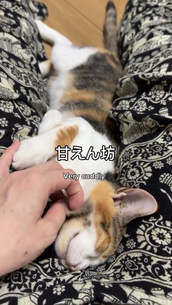 元野良猫だったそうで、今では家族に甘えん坊!サブ美ちゃんは家族の足に挟まり、顎をなでられ幸せそうな表情を見せていました。