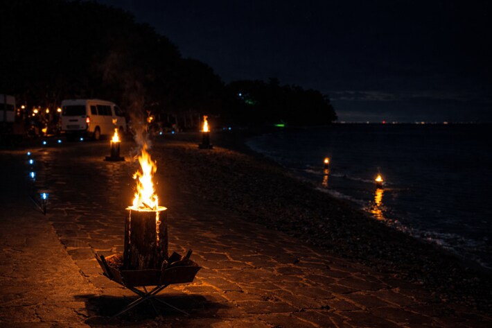 ライトアップの光とは一味違う、自然の火が織りなす「ゆらぎ」を感じながら、夜の海辺を散策する贅沢な時間を提供します。