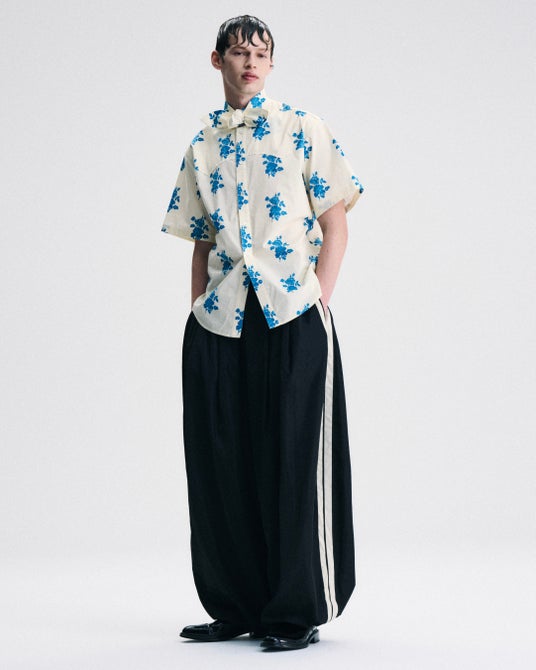 ルネサンス絵画で用いられた光と影をぼかす技法であるʼʼSfumatoʼʼ マスキュリンとフェミニン、タフさと繊細さの境界をあえて曖昧にしながら、 新しいバランスを追求したコレクション。 ウェスタンディテールは今季の構造的な軸となっており、 シャープなヨークやテーラードといったマスキュリンな要素に、 レースやチュールといったシアーでフェミニンな素材感を掛け合わせ、 男性らしさの中に揺らぎを差し込んだ。 ブランドを象徴するモチーフである薔薇。 コレクション全体がダークトーンで構成される中、 視線を奪う鮮やかなブルーで表現。 さらに一部のアイテムには手刺繍で同じモチーフを施しており、 マスキュリンな造形の中にフェミニンな情緒を滲ませている。 ラガーシャツやスポーティーなディテールは、 どこか懐かしさを帯びたレトロな表情で登場しており、 ユニフォームのようなプリントTシャツ、サイドラインによって、 古き良きアスレチックムードを呼び起こす。 重ねられた素材やディテールが生む揺らぎ、そこに宿る手仕事の温もりは、 ただの装飾ではなく、装いに個を映し、新たなメンズウェアの形を提案している。