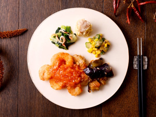 甘酒と塩麹を隠し味に、辛味と酸味をまろやかに引き立てた深みのあるチリソースが自慢。ぷりぷりの海老や、旨味を吸い込んだ揚げナスにたっぷりと絡めてお召し上がりください。