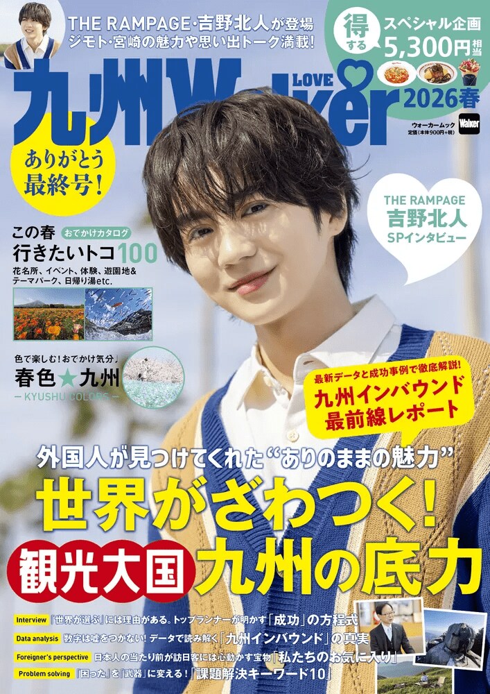 表紙・巻頭には、THE RAMPAGEの吉野北人さんが登場! 生まれ育った地元の宮崎で撮影を敢行し、愛する故郷への想いをたっぷりと語ってくれました。インタビューでは、幼少期に家族と訪れた青島や熊本などの思い出をはじめ、昨年のツアーで堪能した長崎の海鮮グルメなど、九州ならではのエピソードが満載です。さらに、オリコン年間ランキング1位を獲得した2nd写真集『Orange』の制作秘話や、ソロ活動、そして、国際映画祭に出品された最新主演映画「Swim on Vacation」(公開日未定)への意気込みなど、飛躍を続ける現在の心境にも迫ります。「故郷・宮崎や九州でやりたい仕事がいっぱいある」と語る、彼の等身大の魅力が詰まったファン必読の内容です。
