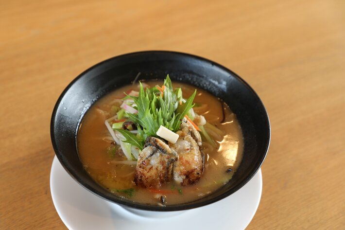 江田島産カキと地元野菜をふんだんに使用した、“オール江田島”の一杯です。特大サイズの牡蠣は、バターでさっと火入れすることで縮みにくく、ぷりっとした食感を実現。りんりんの木耳やキャベツ、白菜などの地元野菜は炒めすぎない絶妙な火加減で甘味を引き出し、素材の力を最大限に生かしています。